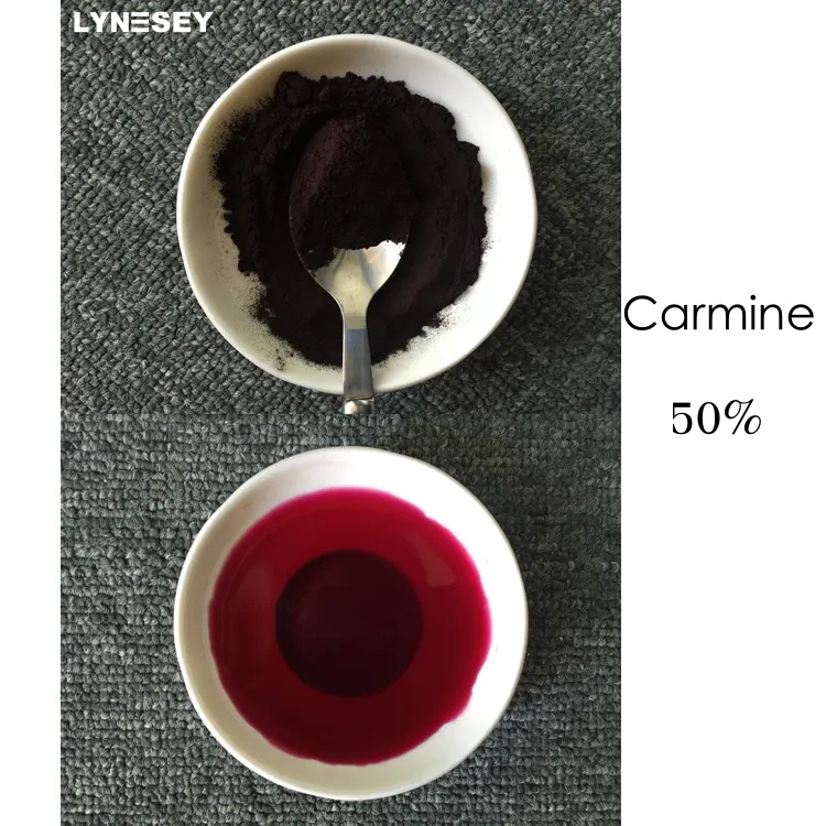 Product Details Basic Information Product: Cochineal Carmine Orgin: Pure Appearance: Red or Purple Powder Purity : 50% or 52% Application: Food or Cosmetic Solubility: Water soluble or oil Soluble Supplier: Lynsey Biotech Ingredients Description Food Pigment Carmine Cochineal Color Food Grade Cochineal Carmine Powder Cochineal Carmine is a pigment extracted from the female cochineal parasitic on cactus plants. The red pigment is obtained by grinding the dried body of the female cochineal and extracting it with water. The main component is cochineal acid (also known as carmine acid, an anthraquinone derivative). Cochineal Carmine is a natural pigment with high safety derived from nature. Cochineal worms are native to Central and South America, Mexico, and other regions. Due to the suitable climate in Peru. Peru has abundant resources in both wild and artificial cactus plantations, making it one of the world's largest producers of cochineal red raw materials. Carmine Cochineal can be used for Food field, Like Frozen products, baked goods, puffed products, dairy products, fruit products, etc also can be used in Cosmetics, like lipstick. Application Food Pigment Carmine Cochineal Color Food Grade Cochineal Carmine Powder